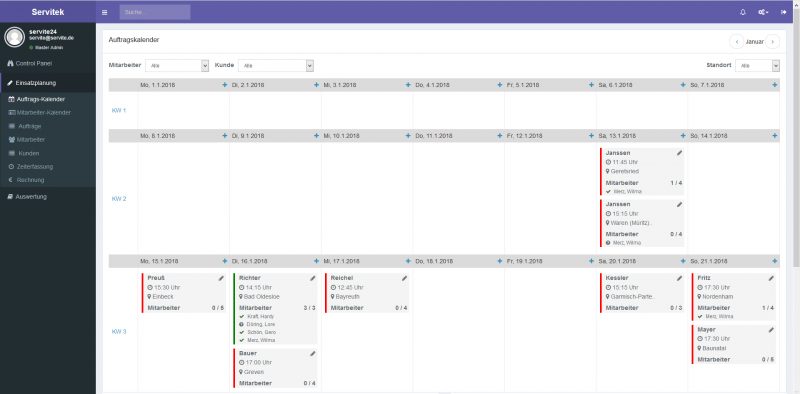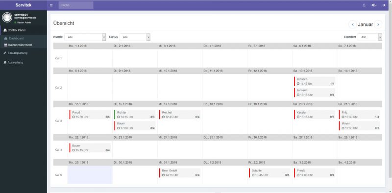 über monatliche und wöchentliche Einsätze mit der Farbkennung rot und grün zum leichten Verständnis des jeweiligen Status‘ eines Kundeneinsatzes.