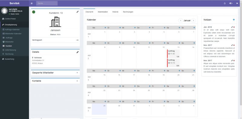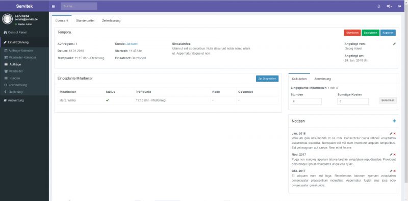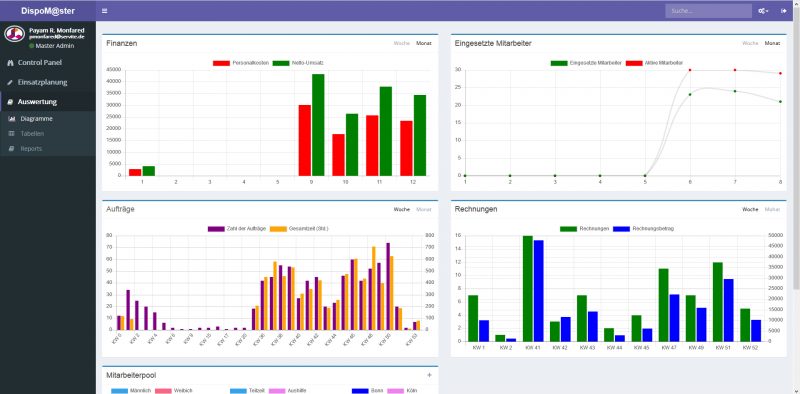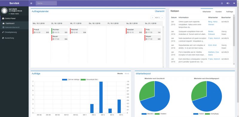 mit allgemeiner Übersicht über Aufträge bzw. Einsätze in der aktuellen KW mit Notizen zu Mitarbeitern, Kunden und Aufträgen. Auswertungen werden angezeigt in Balkendiagrammen oder Pie-Charts.
