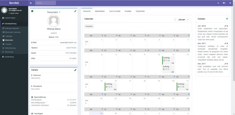 mit Überblick über alle relevanten, den Mitarbeiter betreffenden Informationen wie Stamm- und Vertragsdaten, Einsätze, Urlaubs- und Fehlzeiten, Lohn / Gehalt etc.
