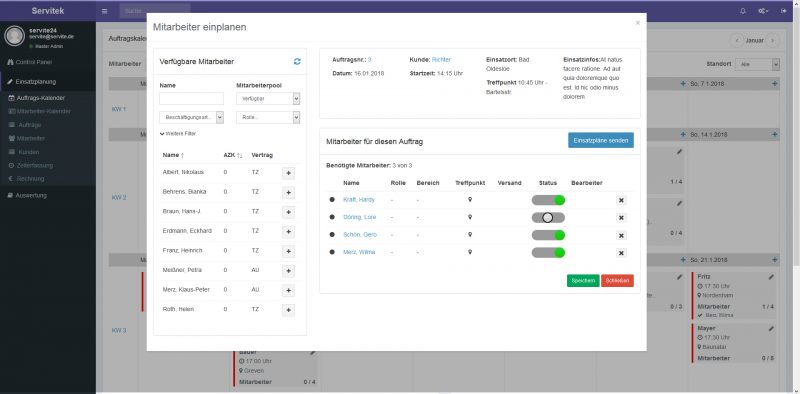 zur schnellen Einsatzplanung verfügbarer Mitarbeiter auf Kundeneinsätze (unter Berücksichtigung der Beschäftigungsart, vereinbarten Arbeitsstunden, Urlaubsplänen Krankmeldungen, Feiertagen etc.)