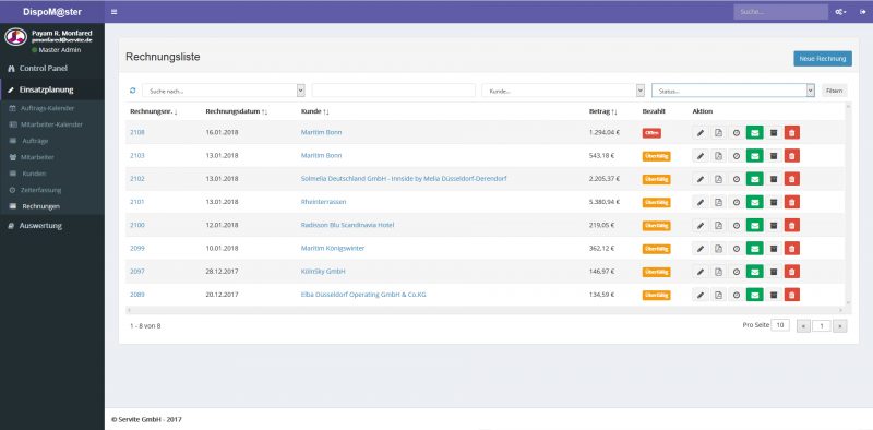 die automatisch im System auf Basis der zeiterfassten Aufträge erstellt und per email an den Kunden versandt werden. Alle Rechnungen sind nach Fälligkeit sortiert und bezahlte Rechnungen werden im System archiviert.