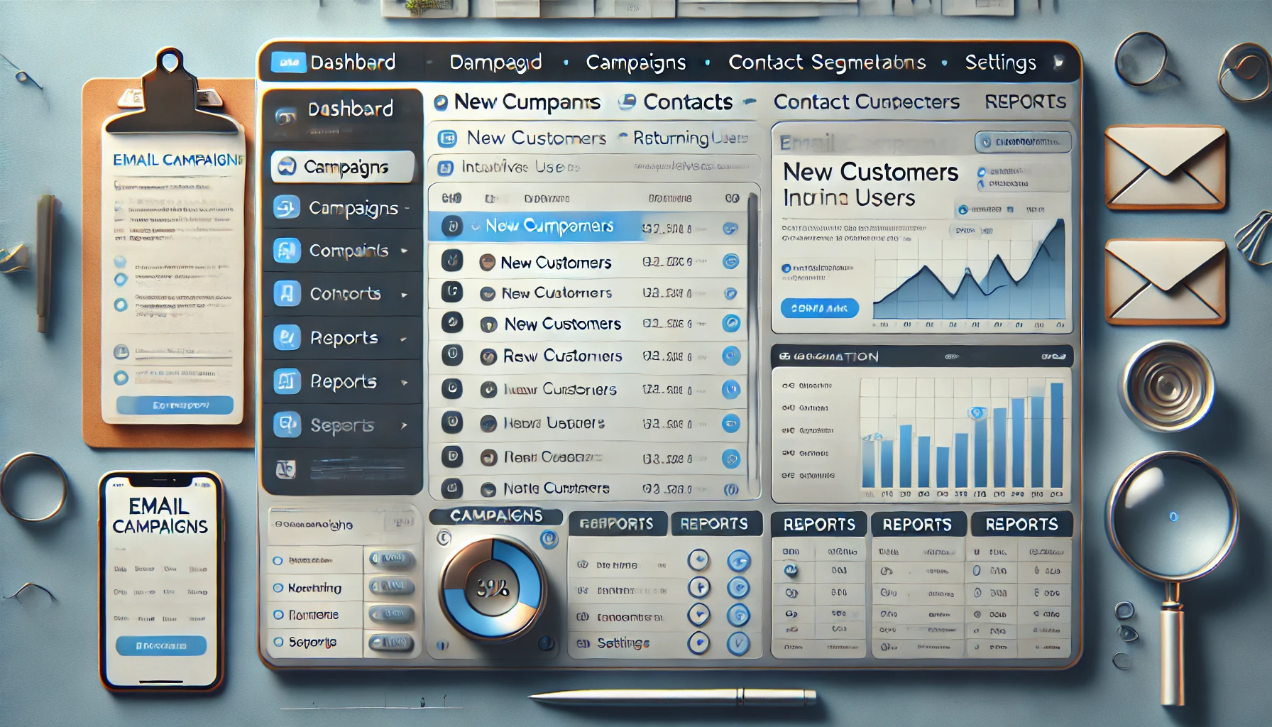 - Die Sidebar bleibt bestehen, aber der Hauptbereich zeigt Grafiken und Diagramme zur E-Mail-Performance, wie z. B. Balkendiagramme für die Öffnungsrate pro Tag, Kreisdiagramme zur Darstellung der Klickrate und eine Liste der E-Mails mit besten Ergebnissen.